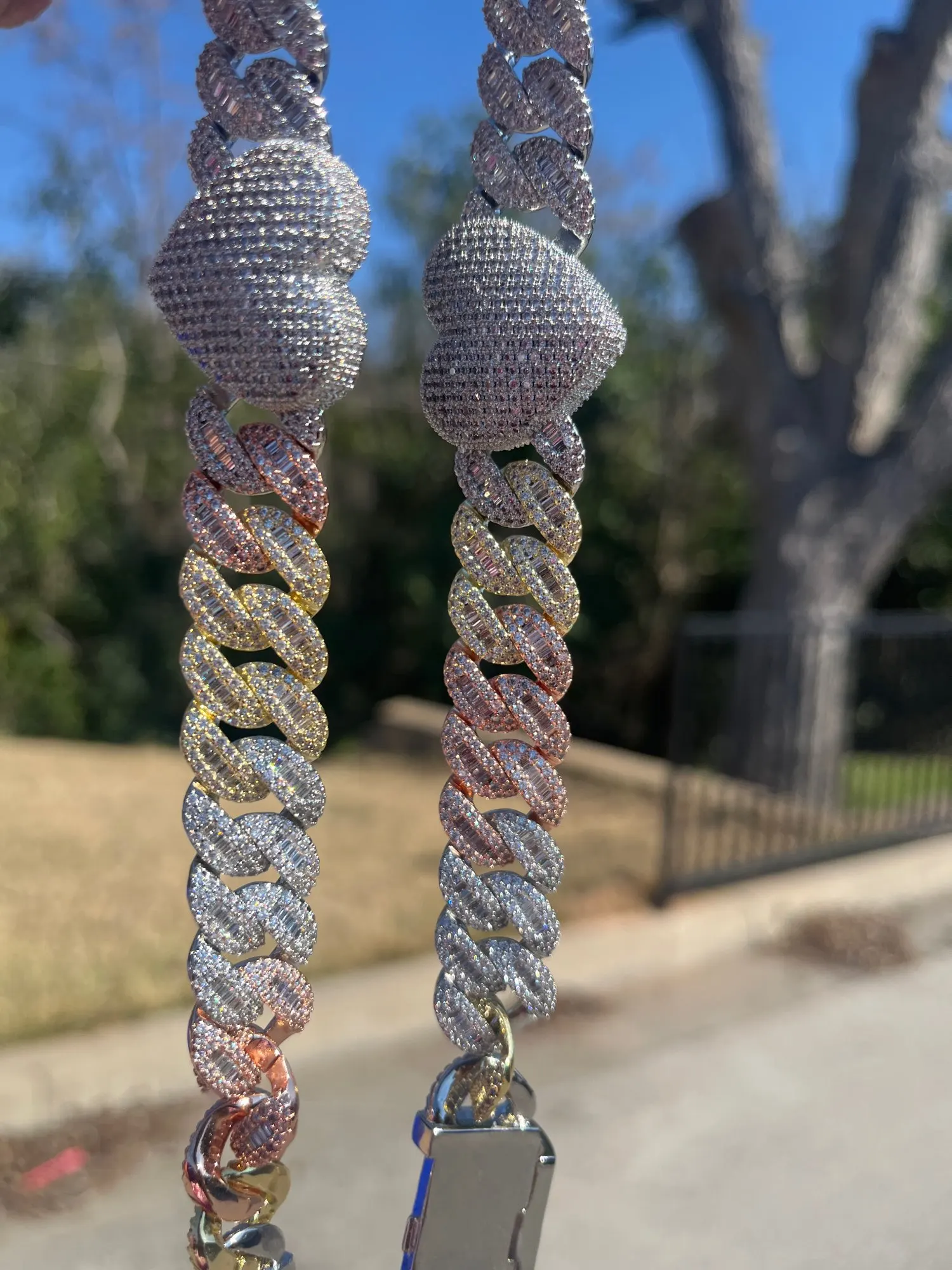 Stand out with the Triple Heart Cuban. Featuring three heart accents on a bold Cuban link chain, it’s perfect for adding romance and style to any look.